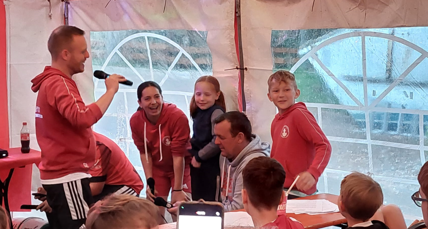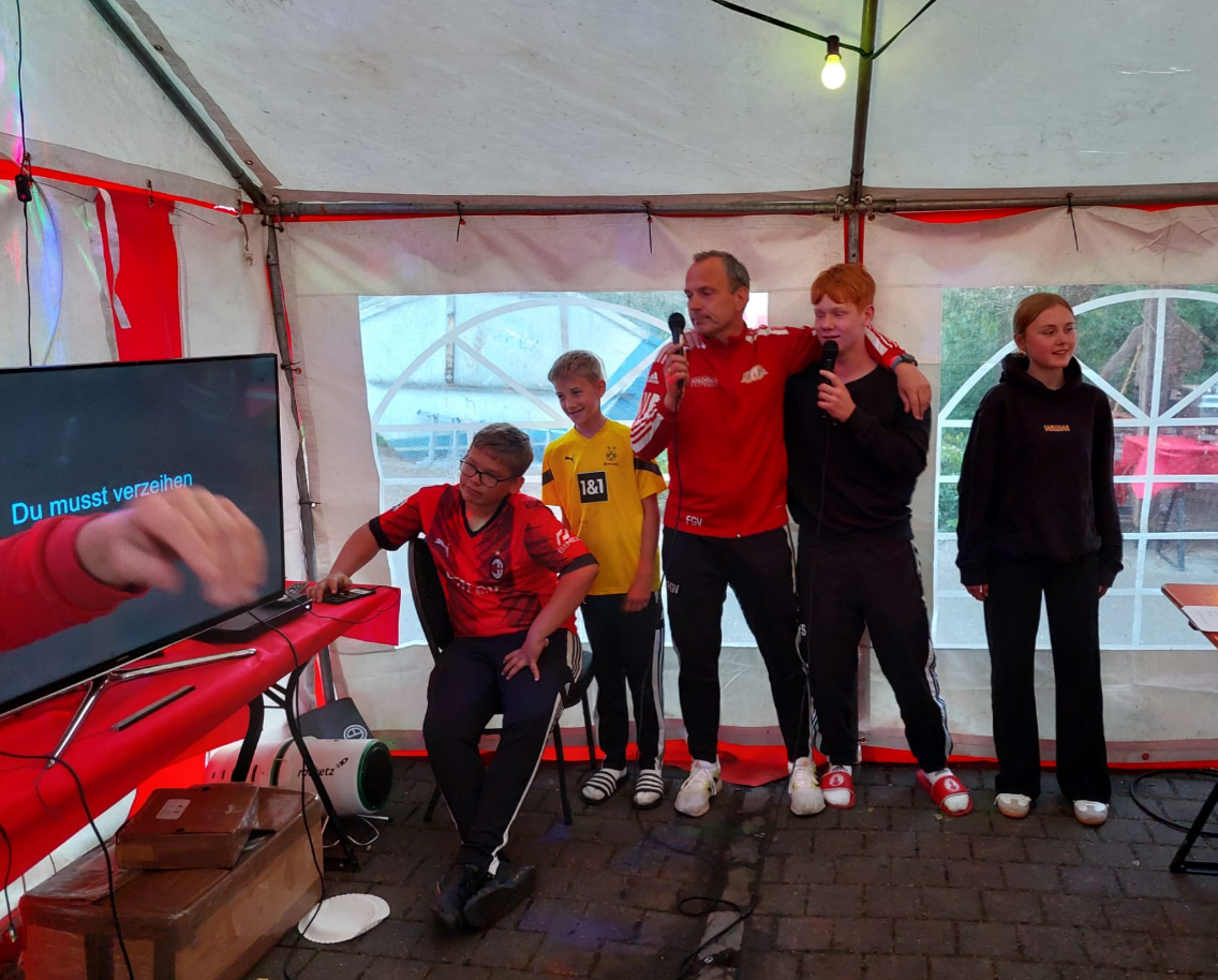Nach dem Frühstück am Sonntag fand die Olympiade ihre Fortsetzung. Bis um 15 Uhr mussten die ausgefüllten Olympiade-Unterlagen bei Lagerleiter Heiko abgegeben werden. So mussten z.B. die letzten Fotos mit Einheimischen noch schnell gemacht werden. Diese unterstützten die Teilnehmer sowie die Organisatoren mit voller Kraft. Nach der Liveübertragung der Spiele der 2. Fußball-Bundesliga steuerte das Lager auf einen weiteren stimmungsvollen Höhepunkt zu. Um die erreichten Punkte der Olympiade zu verdoppeln, musste jedes Team beim Karaoke im Zelt mitmachen. Selbstredend das hier bei den verschiedenen Liedern ein tolle Stimmung aufkam. Die anschließende Siegerehrung brachte das Team „Die Roten Teufel“ (s. Bild) als Sieger der Olympiade hervor.