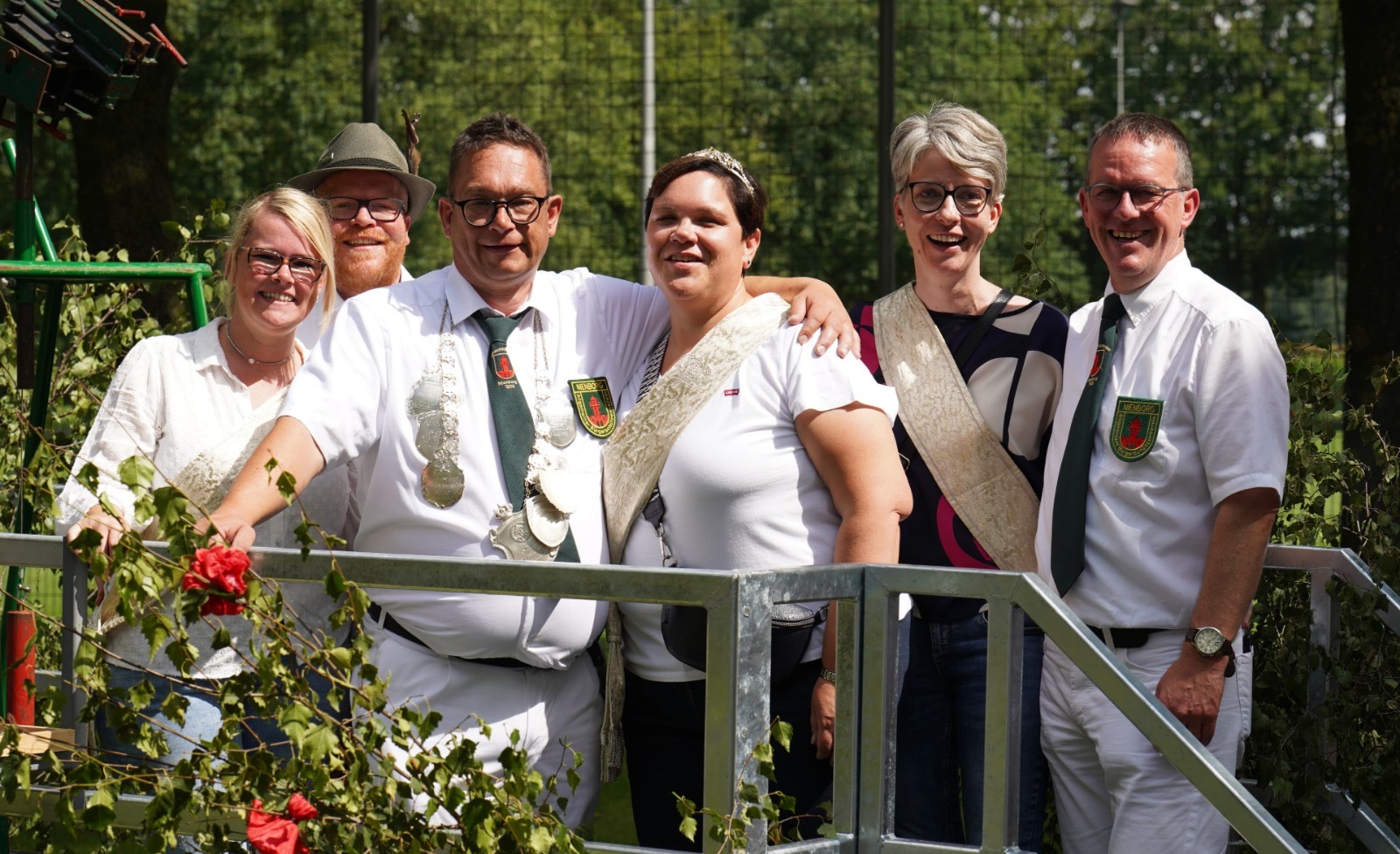 Der Thron von links: Ehrendame Melanie Kuiper, Ehrenherr Tom Kuiper, König Heiko Niemeier, Königin Yvonne Niemeier, Ehrendame Franzis Mensing, Ehrenherr Martin Mensing
